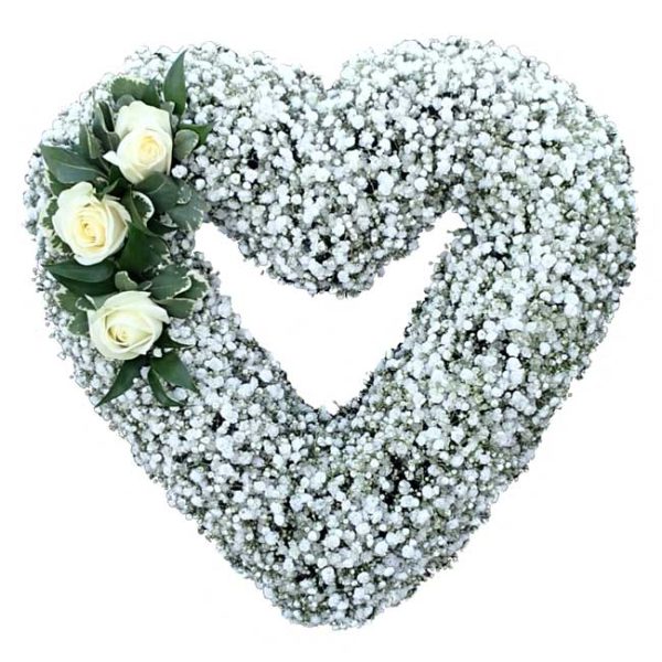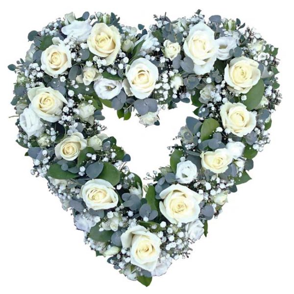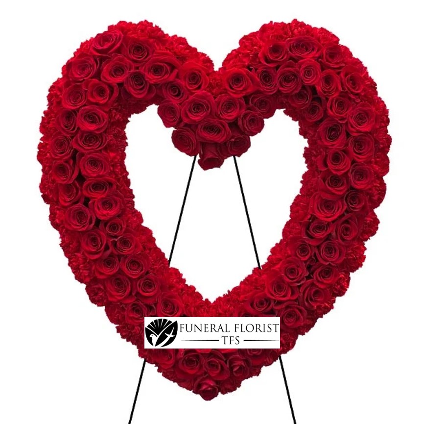 • Funeral Flowers used: roses, lily, gerbera, chrysanthemum and more \n• Heart Shape Wreath Stand Estimated Dimension: height 165cm – width 50cm \n• Comes with stand